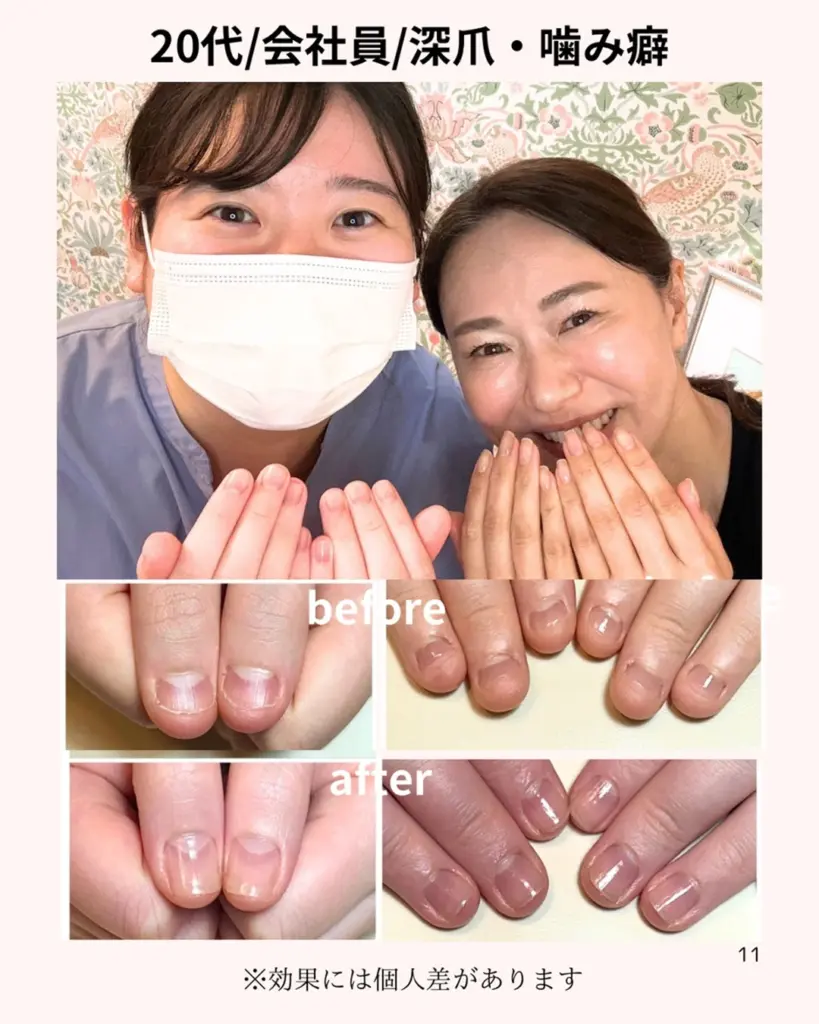 サロンで施術の出来を見た時は正直よく分からなかったのですが、後から送っていただいた写真を見たら爪の形が全く違うことに驚きました。少しずつ変わっていくのを見るのが楽しみになりました。